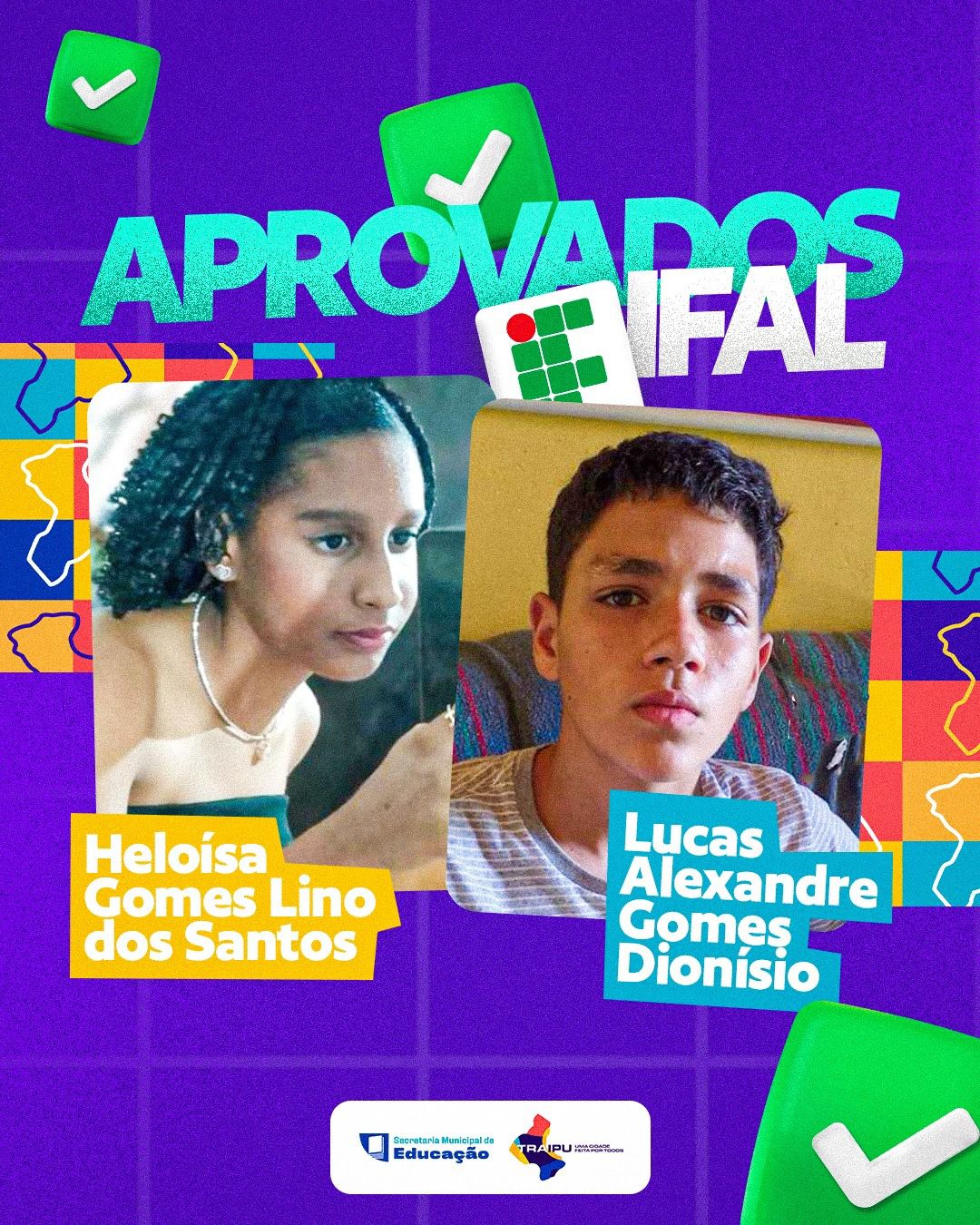Dois estudantes da Rede Municipal de Ensino de Traipu foram aprovados no processo seletivo do Instituto Federal de Alagoas (Ifal) e vão cursar o ensino médio na instituição que tem as provas de acesso considerada difícil.