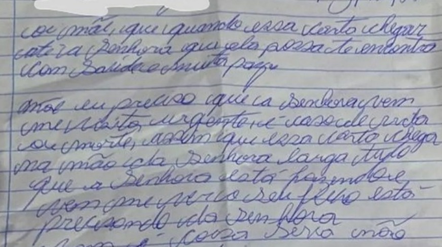 “Mãe, eu preciso que a senhora venha me visitar urgente, é caso de vida ou morte. Assim que essa carta chegar nas mãos da senhora, deixa tudo que estiver fazendo e venha me ver. Seu filho está precisando da senhora”, dizia parte do pedido enviado à mãe.