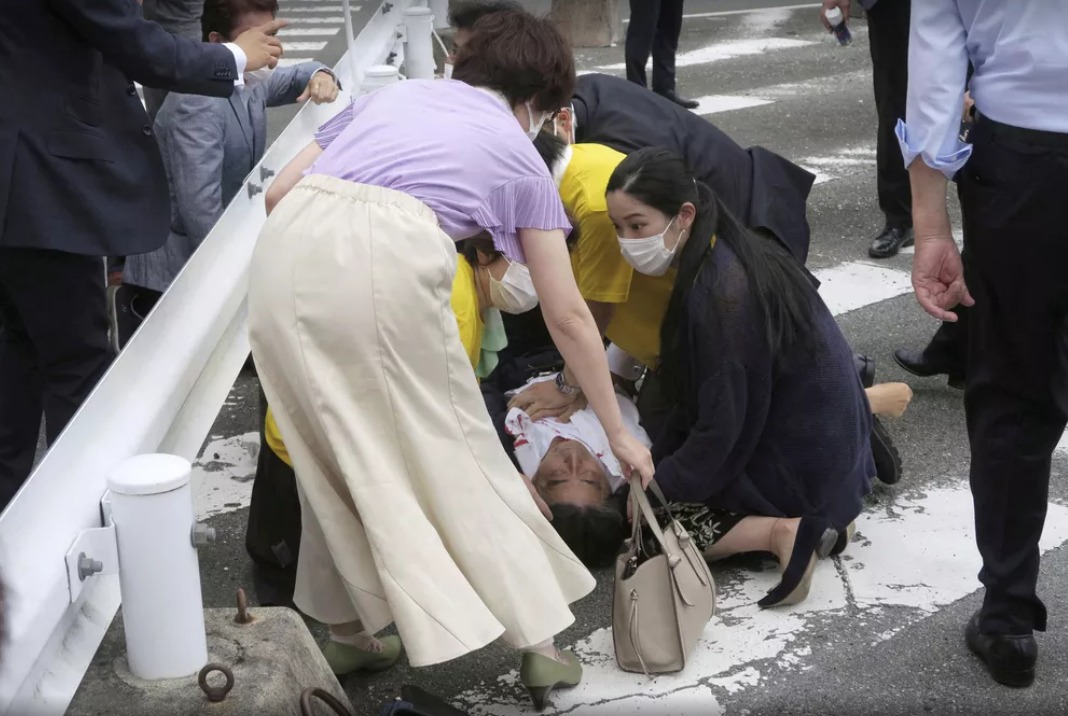 Ex-primeiro ministro japonês, Shinzo Abe, no chão após ser atacado — Foto: Kyodo via REUTERS