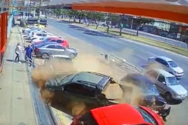 Câmeras de segurança flagraram o momento em que um motorista embriagado e sem (CNH) Carteira Nacional de Habilitação bateu em alta velocidade contra 4 (quatro) automóveis estacionados no local.
