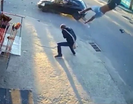 Segundos depois, a moto bate no carro e o motociclista, que estava sem capacete, é arremessado e passa por cima do carro e da cabeça de um pedestre, que andava pela calçada. Após a queda, o homem tenta se levantar, mas não consegue.